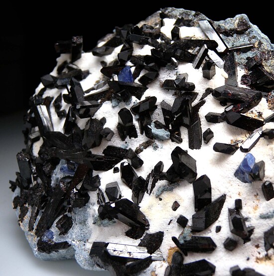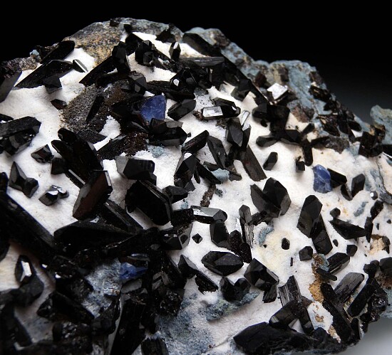 Large schist matrix covered by white Natrolite hosting many beautiful black Neptunite crystals and three bright blue Benitoite crystals. This is a highly showy display specimen of this classic and rare California combo. The Neptunite crystals are robust and reach 3cm in size. Ex. Randy Parnagian collection.