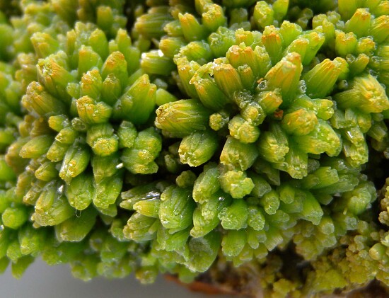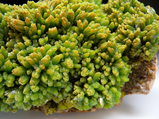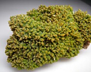 Dense coverage of green Pyromorphite crystals covering a white Calcite matrix. The crystals are in great condition. Ex. Randy Parnagian collection.