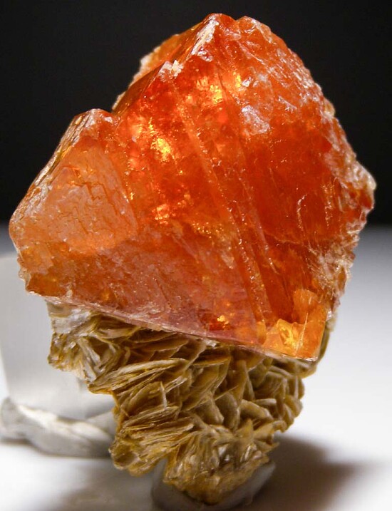 A 4.2cm orange Scheelite crystal on a matrix of Muscovite crystals. The Scheelite is translucent with transparency at the termination and has a strong orange color. Comes with a custom Lucite display base. Ex. Randy Parnagian collection.