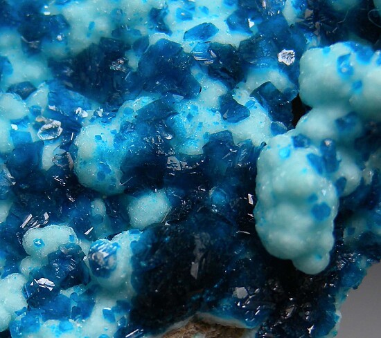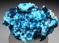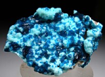 Deep blue crystals of Veszelyite on sky blue Hemimorphite. The Veszelyite occurs as isolated crystals to 4mm in size. A beautiful example from this find. The locality is a former Limestone quarry with Lead, Zinc, and Copper mineralization that closed in 2018.