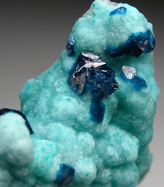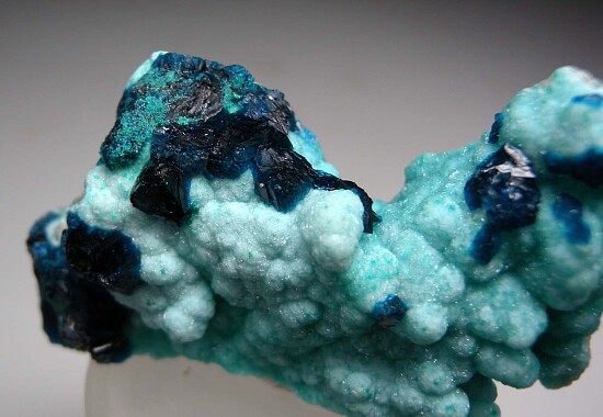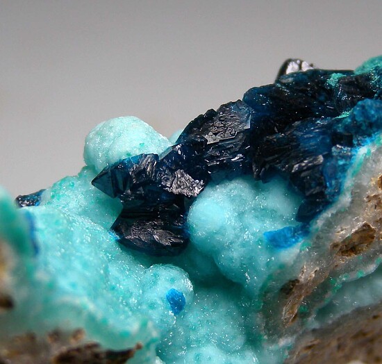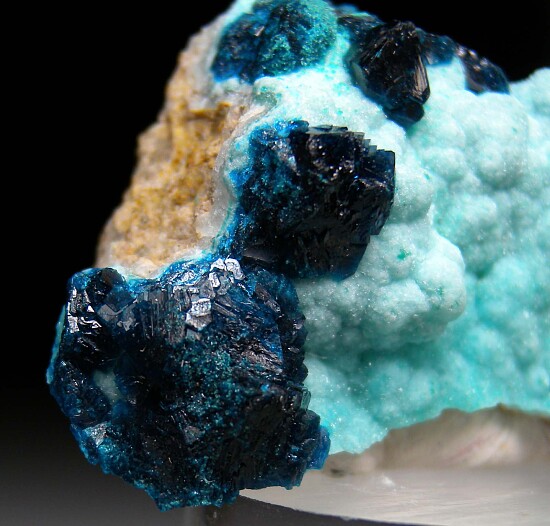 Deep blue crystals of Veszelyite on sky blue Hemimorphite. The Veszelyite occurs as both larger crystal groups and isolated crystals to 6mm. Micro greenish/blue crystals of Kipushite, a rare copper and zinc phosphate species, are present on the Hemimorphite. The locality is a former Limestone quarry with Lead, Zinc, and Copper mineralization that closed in 2018.