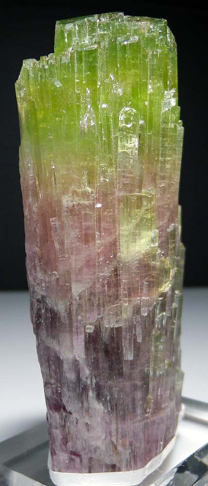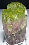 Large single pink and green Tourmaline crystal from Afghanistan. Translucent to transparent and well terminated with smooth, glassy termination faces. The back side has some contacted growth. The bottom is also rehealed. Comes with a custom Lucite display stand. Ex. Randy Parnagian collection.