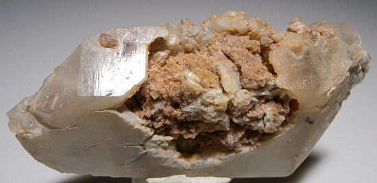 Doubly-terminated Quartz crystal from the well known White Queeen Mine in Pala. The crystals is cut smooth on the backside and has a open vug with small mica crystals on the front center. Comes with an old Minerals Unlimited label.