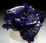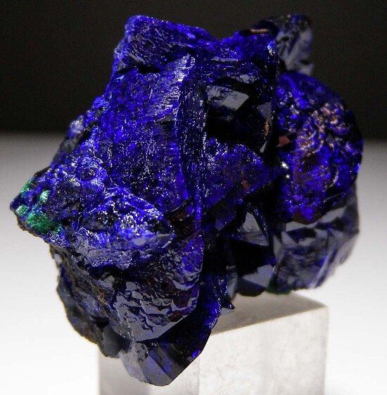 Highly lustrous, deep blue Azurite crystals with Malachite from the famous Watercourse Pocket of the Milpillas Mine. Specimens from this pocket are noted for their vivid blue color and the presence of filament-like Malachite on the back sides. Crystals to 2.5cm.