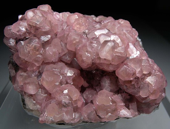 Bright pink, translucent Smithsonite crystals on matrix from Tsumeb. Large specimen with translucent crystals in great condition. Comes with a custom Lucite base. Ex. Randy Parnagian collection.