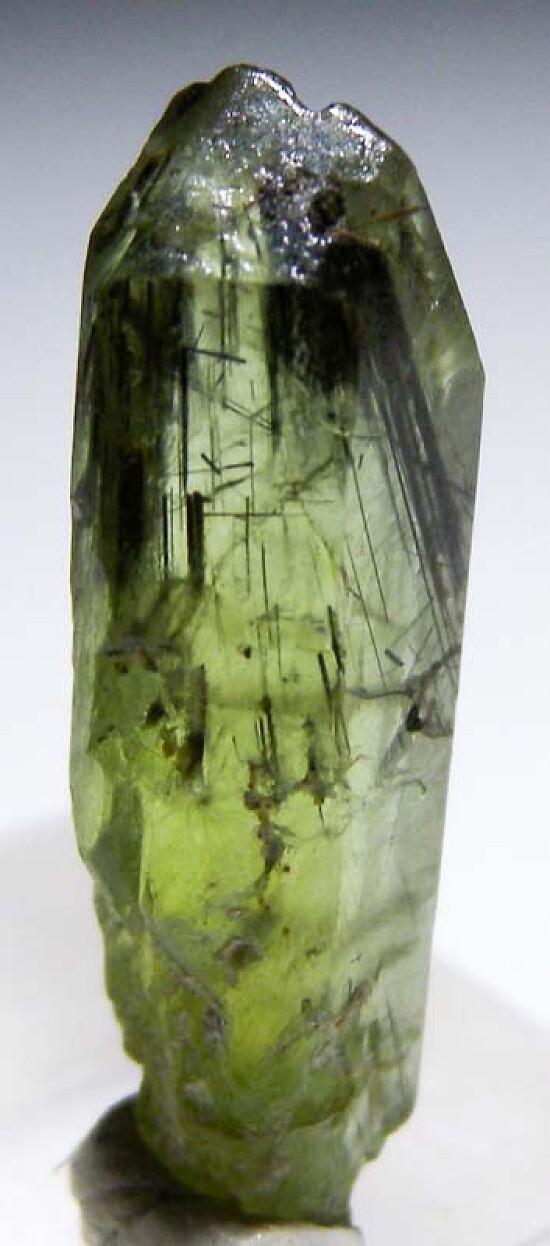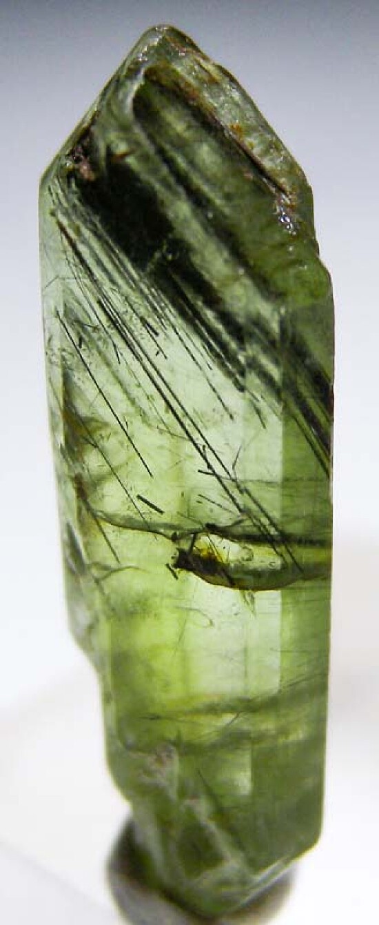 Transparent single Peridot crystal from Pakistan. Well terminated and complete all around with hair-like inclusions of black Ludwigite inside.