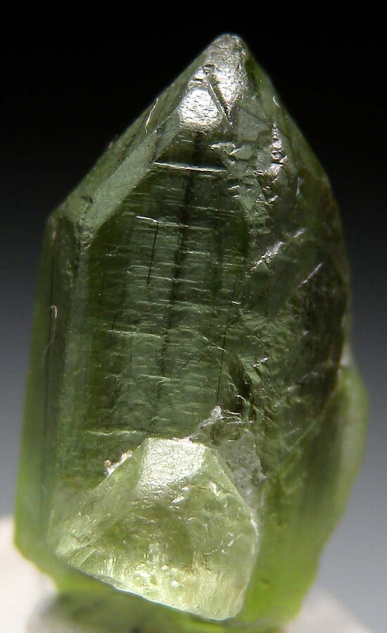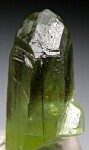 Transparent single Peridot crystal from Pakistan. Well terminated and complete all around with hair-like inclusions of black Ludwigite inside.