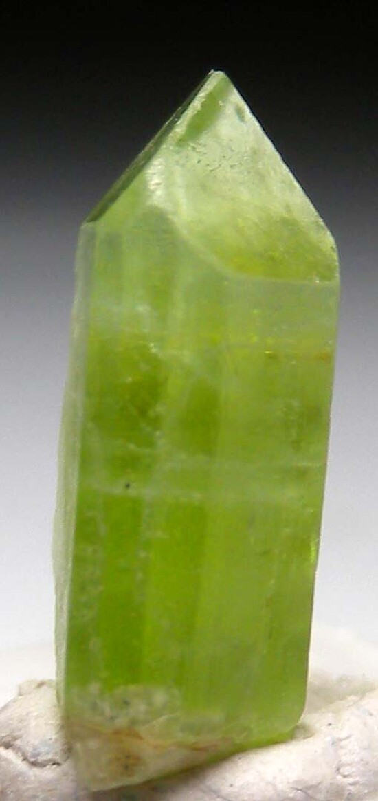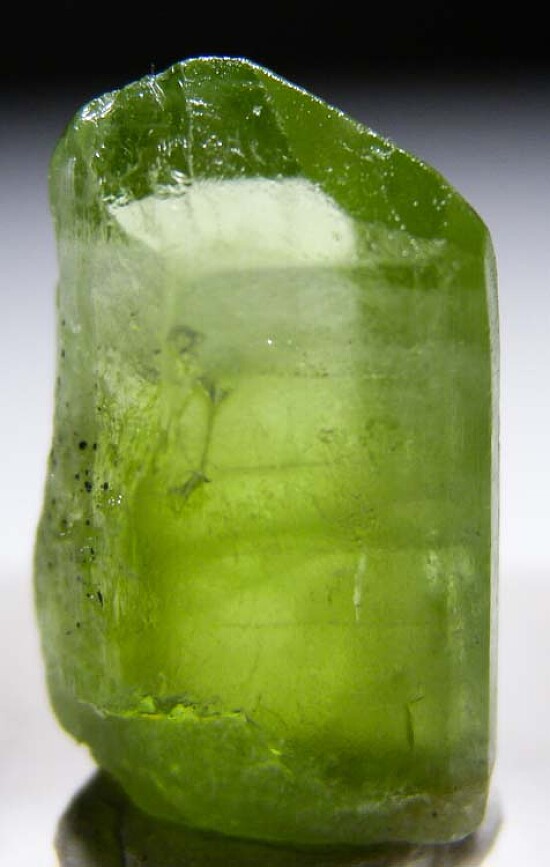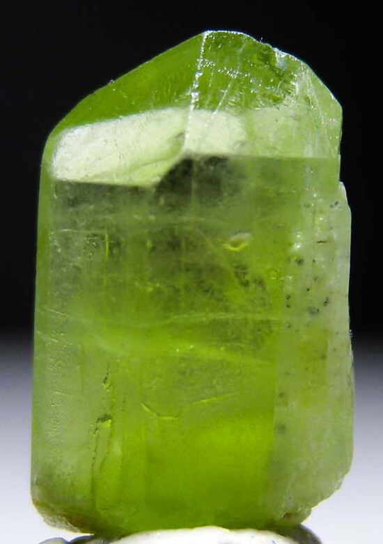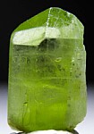Transparent single Peridot crystal from Pakistan. Well terminated and with sharp form, contacted growth on one edge.