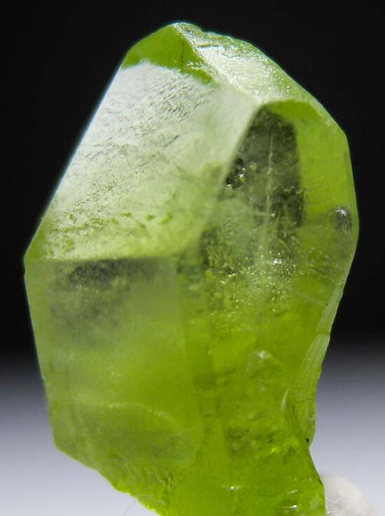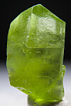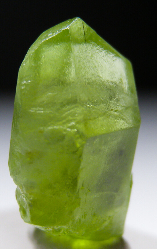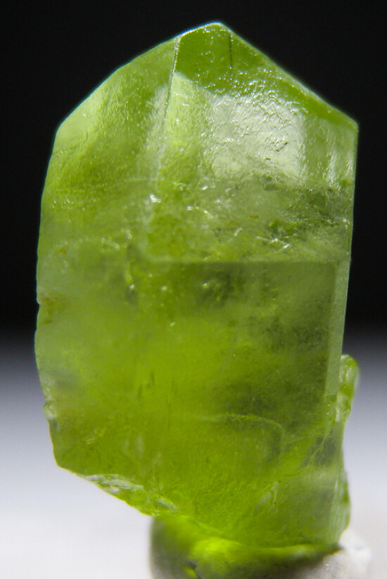 Transparent single Peridot crystal from Pakistan. Well terminated and complete all around with an indentation on the back base from another crystal. Sharp jewel-like crystal.
