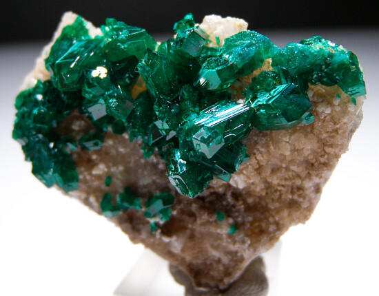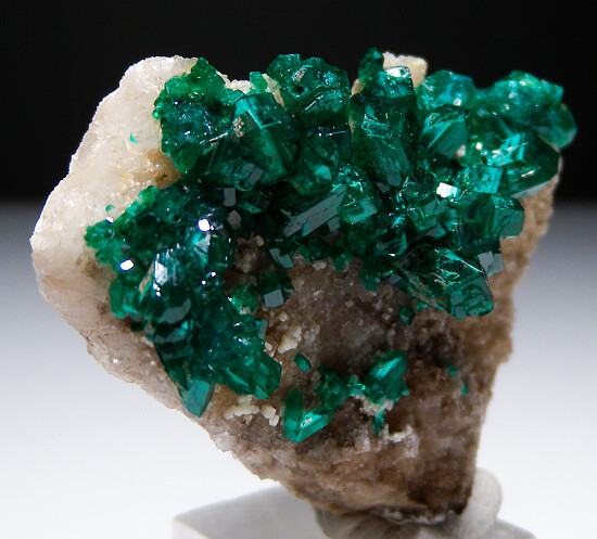 New find of Dioptase crystals with white Willemite crystals from near Mindouli. The Dioptase crystals grow atop solid white Calcite. Small Willemite crystals are present atop the Calcite and around the Dioptase crystals. Was listed at $200 in my regular website galleries.