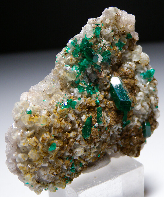 New find of Dioptase crystals with white Willemite crystals from near Mindouli. The Dioptase crystals reach 1cm in size . The Dioptase grow atop white Willemite crystals atop a matrix of solid white Calcite.
