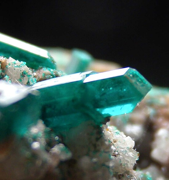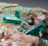 New find of Dioptase crystals with white Willemite crystals from near Mindouli. The Dioptase crystals reach 1.1cm in size and include some doubly-terminated crystals. Anear floater specimen with crystals all over.