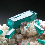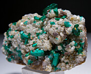 New find of Dioptase crystals with white Willemite crystals from near Mindouli. The Dioptase crystals reach 1.1cm in size and include some doubly-terminated crystals. The Dioptase grow atop white Willemite crystals.