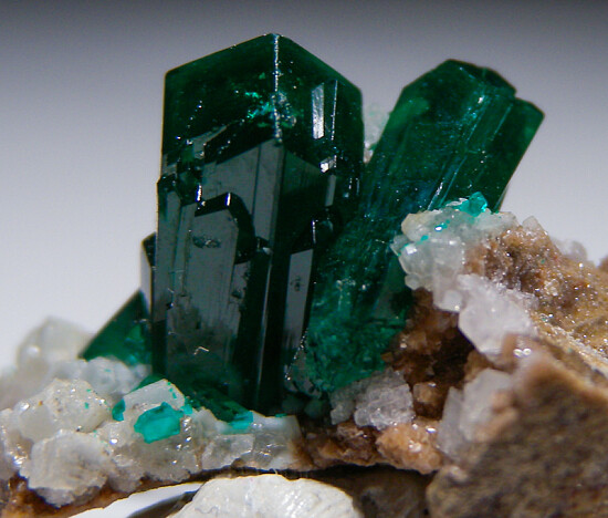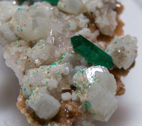 New find of Dioptase crystals with white Willemite crystals from near Mindouli. The Dioptase crystals reach 1.1cm in size and the one crossing behind the large crystal is doubly-terminated. The Dioptase grow atop white Willemite crystals. Best thumbnail of the group.