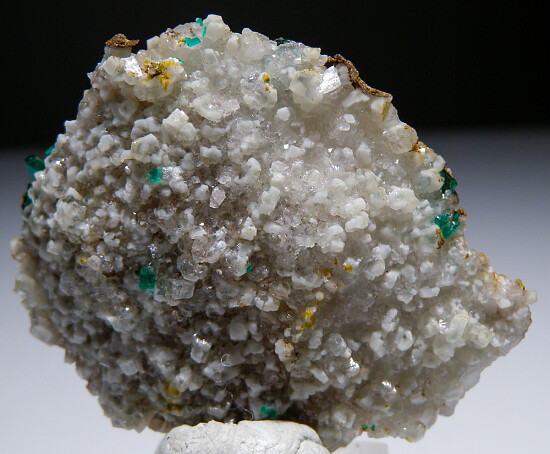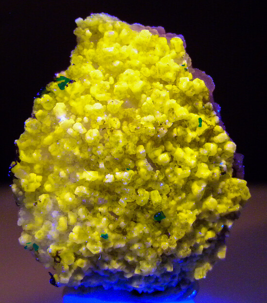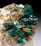 New find of Dioptase crystals with white Willemite crystals from near Mindouli. The Dioptase crystals occur on one side of the white Calcite matrix. The other side is covered by white Willemite crystals. The Willemite are a bright yellow under UV lighting. This is a rare combination that I've only seen previously from Tsumeb. Valued at $250+.