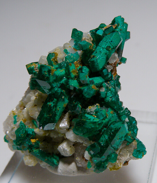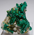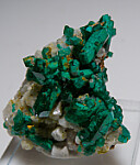 New find of Dioptase crystals with white Willemite crystals from near Mindouli. The Dioptase occur with white Willemite crystals atop solid white Calcite.