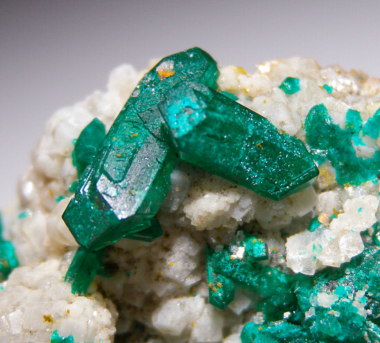 New find of Dioptase crystals with white Willemite crystals from near Mindouli. The Dioptase crystals reach 1.3cm in size and include some doubly-terminated crystals. The Dioptase grow atop white Willemite crystals. More isolated Willemite crystals cover the back side of the specimen.