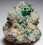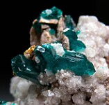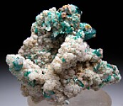 New find of Dioptase crystals with white Willemite crystals from near Mindouli. The Dioptase crystals reach 1.0cm in size. The Dioptase grow atop white Willemite crystals and small white Calcite crystals. This one has good Willemite crystals on all sides.