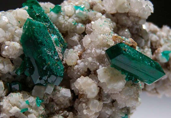 New find of Dioptase crystals with white Willemite crystals from near Mindouli. The Dioptase crystals reach 1.2cm in size and include some doubly-terminated crystals. The Dioptase grow atop white Willemite crystals. A beautiful large double terminated Dioptase crystal sits front and center with both termination off the matrix.