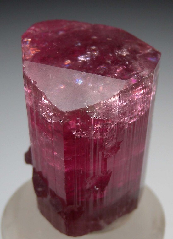 Bright pink, translucent single Tourmaline crystal with attached Lepidolite. Rich, juicy pink coloration and a glassy beveled termination make for a showy gem crystal specimen. Complete and undamaged and weighs 42.78 grams.