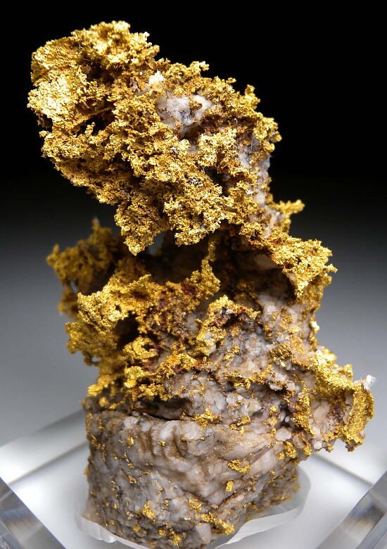 Large mass of solid Gold rising up out of a white Quartz matrix. Gold also runs all through the Quartz at the base. A large and classic old California Gold originally purchased from Kristalle decades ago. It weighs approximately 11.8 ounces on my postal scale. I ran a specific gravity test on it and calculated there is approximately 5.56 Troy ounces of Gold in the specimen. At $2000/ounce, this equates to approximately $11,000 in Gold value alone in the specimen. It's an old piece that could also be improved with cleaning in a modern specimen lab. Ex. Randy Parnagian collection. Comes with a custom Lucite base.