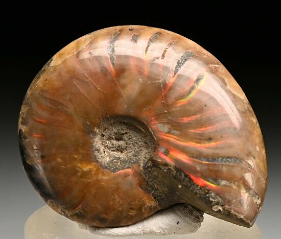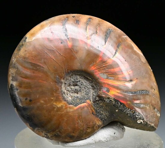 Fossilized Ammonite from Madagascar with fiery red irridescent flashes when turned in hand. It has been polished which enhances the irridescent coloration. Good color flashes on both sides.