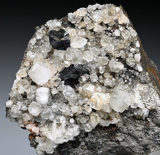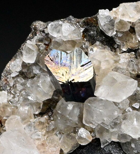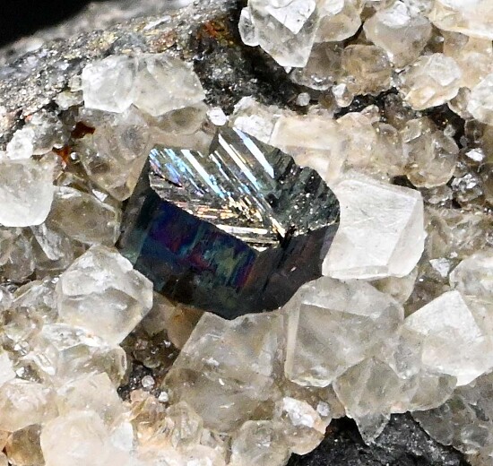Rare matrix Cubanite specimen featuring two Cubanite crystals and Calcite crystals on a sulfide matrix. The largest Cubanite is 7mm wide and shows twinning striations.
