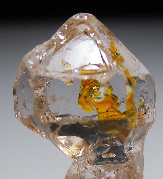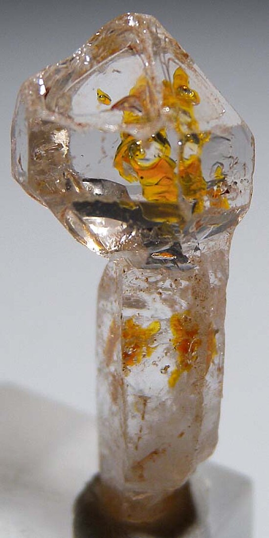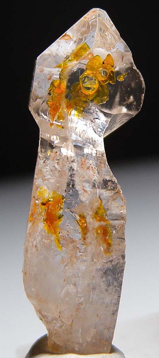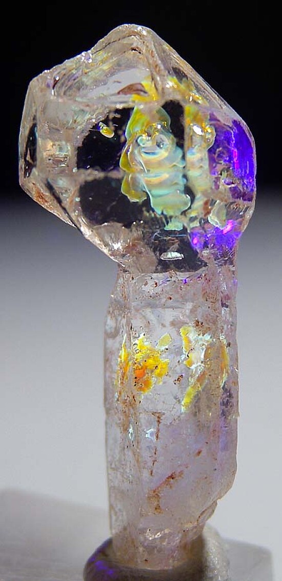 Transparent Quartz scepter with inclusions of fluorescent yellow petroleum! This is complete all around and undamaged.