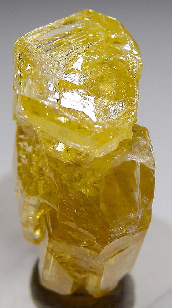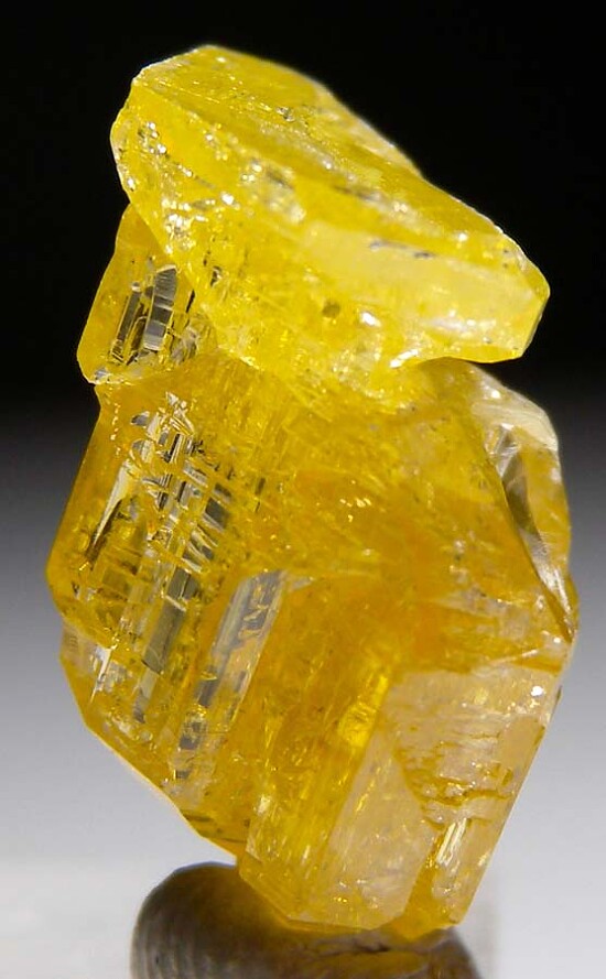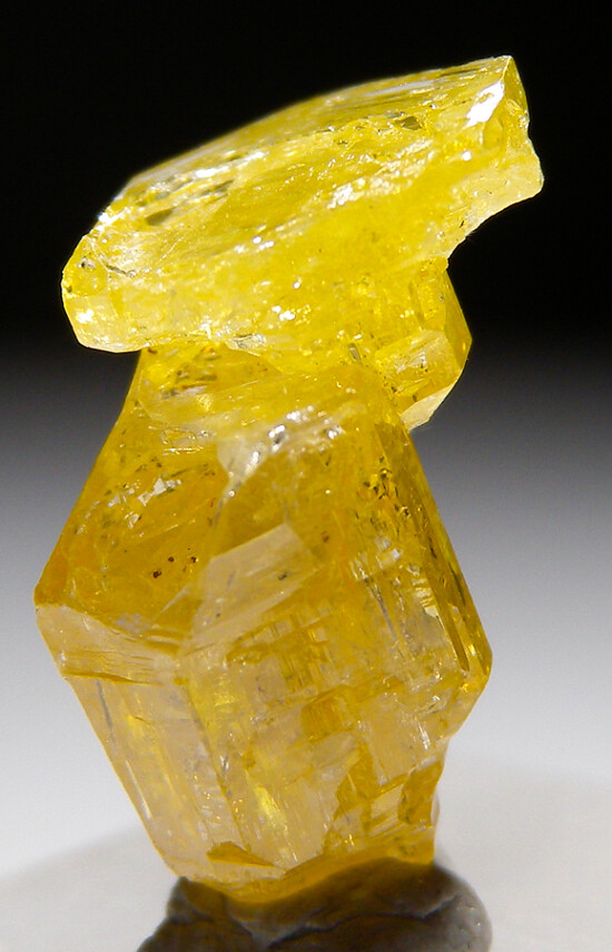 Glassy golden yellow single Mimetite crystal from old finds in Thailand. Complex form, glassy luster, and great color characterize this one. It's also partially double-terminated with just a tiny point of contact on the base.