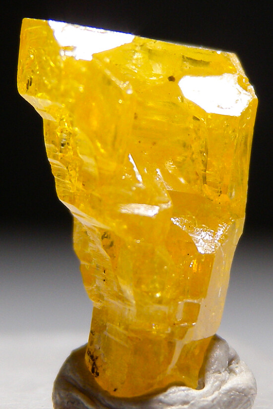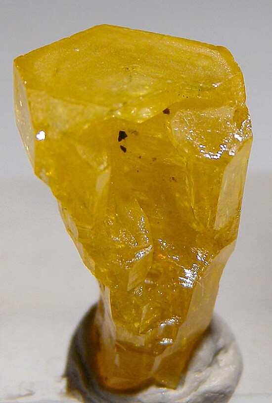 Glassy golden yellow single Mimetite crystal from old finds in Thailand. Complex form, glassy luster, and great color characterize this one.
