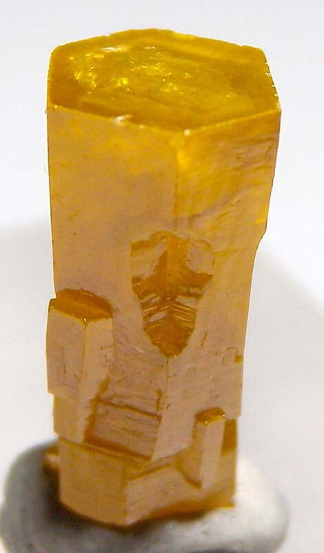 Glassy golden yellow single Mimetite crystal from old finds in Thailand. Complex form, glassy luster, and great color characterize this one.
