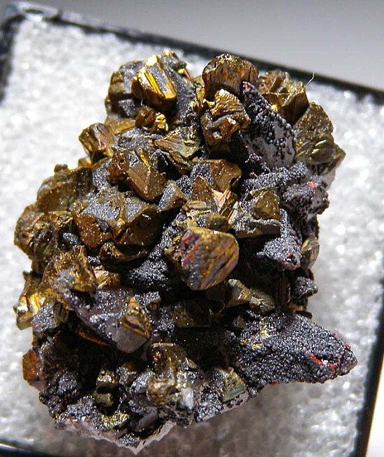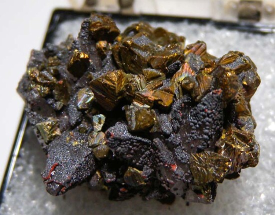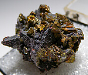 Stalactitic formation of scalenohedral Calcite crystals covered by Chalcopyrite crystals. Ex. Dennis Ewell collection.