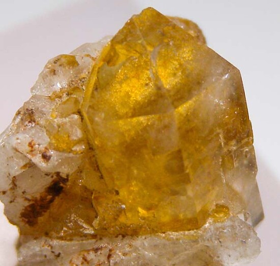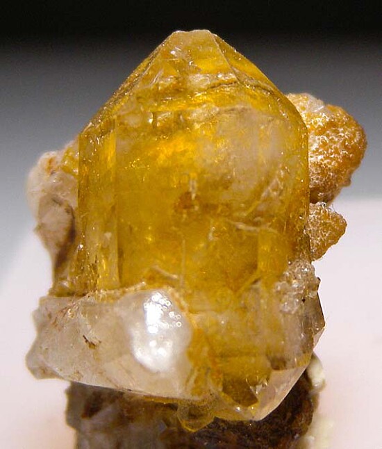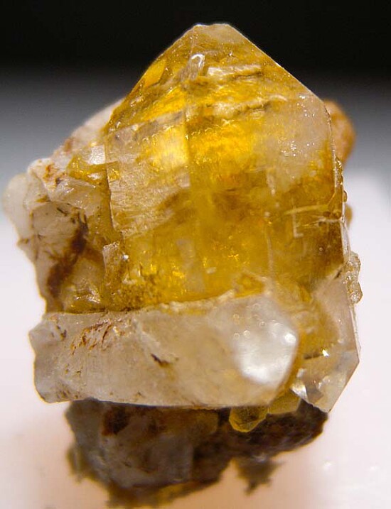 Double-terminated transparent Citrine crystal on Albite. Choice glassy, transparent crystal. Intergrown with white Albite crystals. Ex. Dennis Ewell collection. Valued at $60.