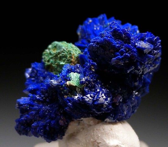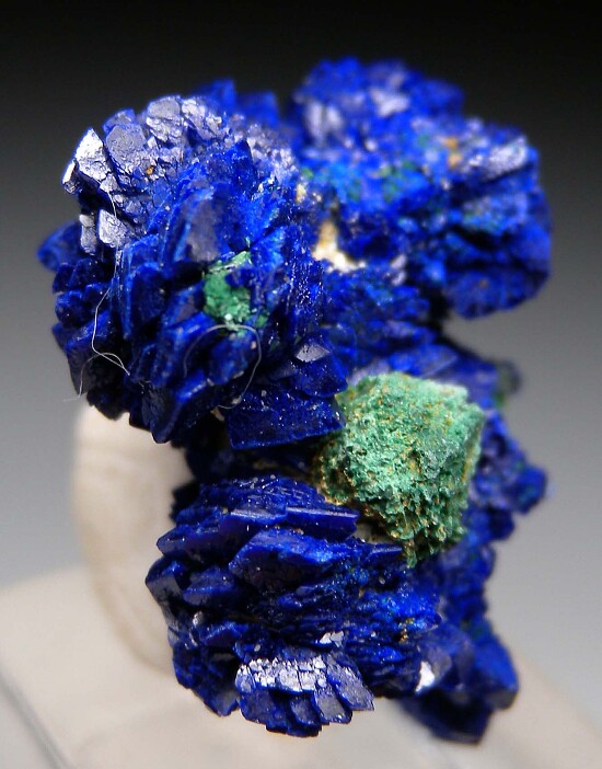 Well crystallized Azurite with attached green Malachite. A floater cluster well crystallized all around. This is a beautiful, bright, and colorful specimen from the fine thumbnail collection of former Californai collector Dennis Ewell. Valued at $180.