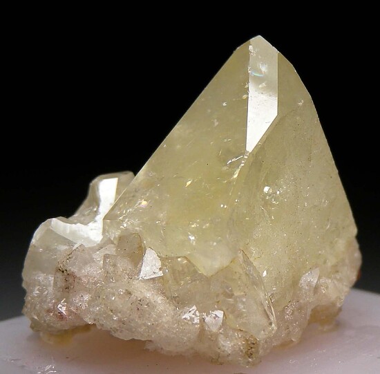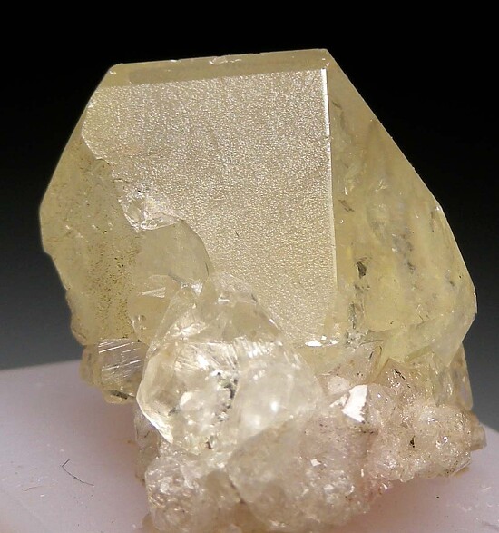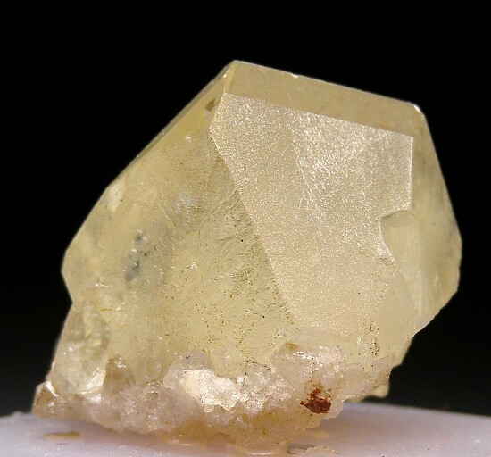 Large glassy single Datolite crystal from New Jersey. The crystal is complete all around, 2.2cm wide and has areas of transparency. It has a light green color and alternating faces of glassy and matte surface luster. Ex. Dennis Ewell collection.