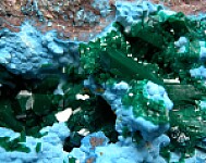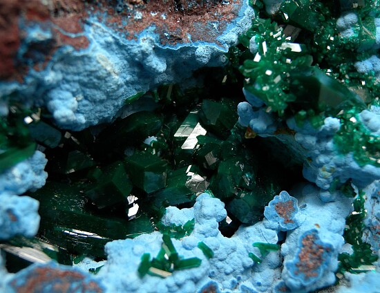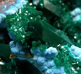 Large, elongated Dioptase crystals in a vug lined by blue Plancheite. Stunning, fine quality specimen from the Irv Brown collection (who was reluctant to let this one go!). This specimen is illustrated on page 185 of the Namibia II book written by Ludi von Bezing. Comes with a custom Sunnywood Lucite base. Fun fact: this specmimen won first place at a contest held at the birthday party for area collector Jack Halpern at his home in San Francisco. Attendees were asked to bring a 'best Jack rock'. Once all the pieces were assembled on a table, Jack judged the specimens and selected this Dioptase as his favorite of them all.