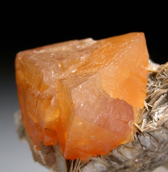 Transparent to translucent single Scheelite crystal on Muscovite. The Scheelite is complete and undamaged an 4cm tall. Quality, well selected specimen from the Dr. Steven Morehead collection.