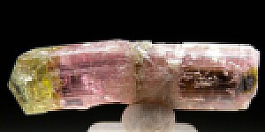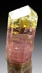 This is an uncommon oddity of a Tanzanian Dravite, both in color and form. This locality is known for it's 'rootbeer' brown Dravite crystals, but sometimes crystals with other colors were found. This one starts at the base as a transparent pink crystal with a dark central core. Half way up it experienced fracturing and rehealing resulting in a natural bend that is slightly offset. From there, the dark core goes away leaving a pure pink zone, followed by a yellow termination - just amazing! Complete all around and undamaged.