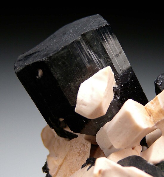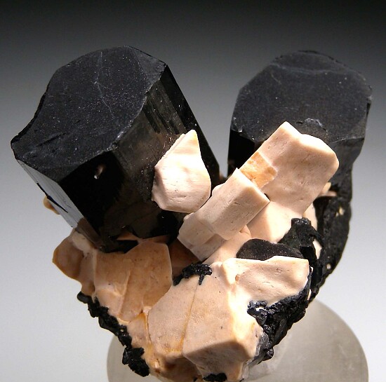 Two terminated black Schorl Tourmaline crystals with attached tan Feldspar crystals. Quality, well selected specimen from the Dr. Steven Morehead collection.