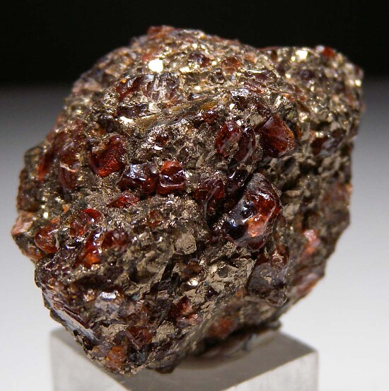 Colorful and uncommon specimen of red Rhodonite crystals embedded in Pyrite. This are usually foound in Galena. This is out of an old collection and the only one I've seen with crystals in Pyrite. Makes for a more colorful and rare specimen.