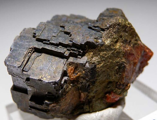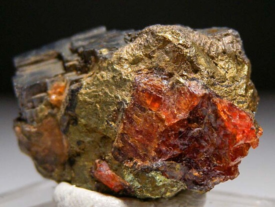 Deep red Rhodonite crystals in crystallized Galena. There are multiple Rhodonite crystals present and what makes this unusual is that the Rhodonite are surrounded by Pyrite (or Chalcopyrite), which is uncommon in my experience. It's from an old collection and good from all sides. These are Broken Hill classics.