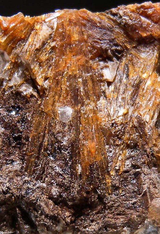 Fibrous orange crystals of Inesite with Quartz crystals. Better known from South Africa, here's a nice Australian example.