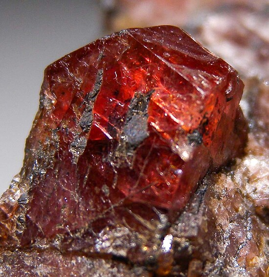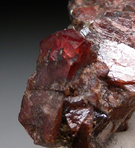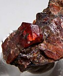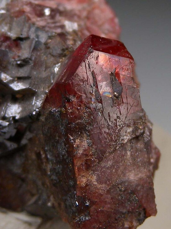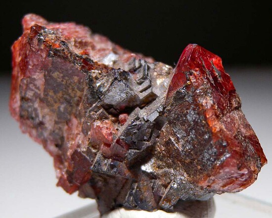 Terminated cherry red Rhodonite crystal attached to a matrix of shiny metallic crystallized Galena and more crystallized Rhodonite. The front Rhodonite crystal is well terminated and 1.7cm tall. Out of an old collection, these are Broken Hill classics now hard to find.