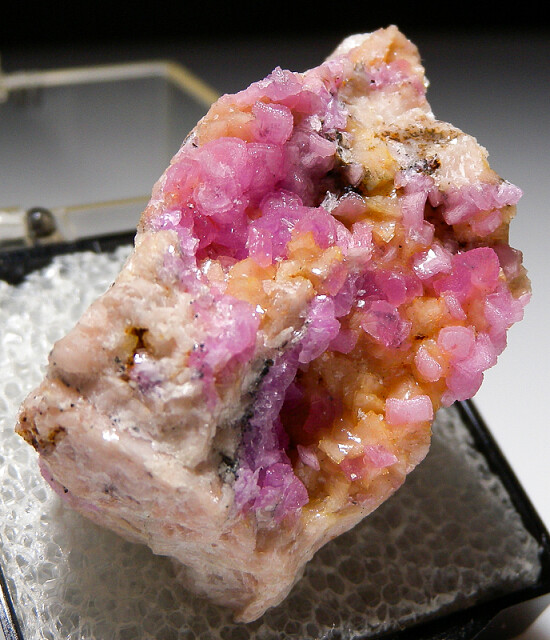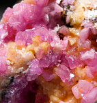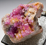 Well formed, bright translucent pink crystals of Cobaltian Calcite on matrix. Good crystals on this showy thumbnail. Ex. Dennis Ewell collection.