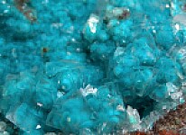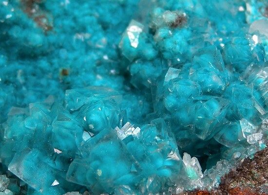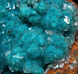 Large, shallow vug in Limonite filled with vivid blue Aurichalcite included Calcite crystals. The Calcite crystals are transparent and reach 9mm in size. You can see the spherical Aurichalcite crystals under and within the Calcite. Ex. Randy Parnagian collection.