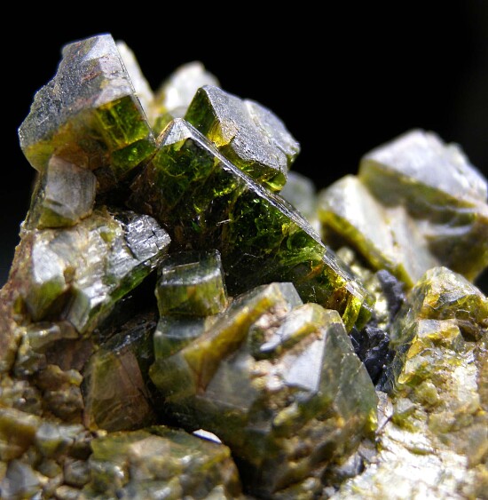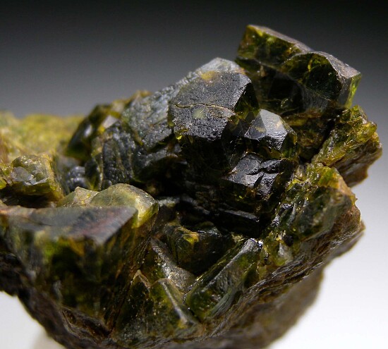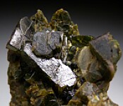 Hedenbergite crystals to 1.5cm in a matrix of massive Hedenbergite. While commonly seen as inclusions in Quartz, good stand alone crystals of Hedenbergite are not common, and some of the very best were found at Broken Hill.