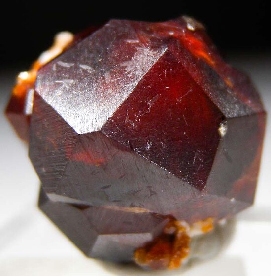 Cluster of large (very good sized for this locality) Spessartine crystals that have grown on both sides of thin piece of rock matrix. Fine satiny luster with rich color and sharp edges. Individual crystals reach 1.8cm wide!!! In great condition too.