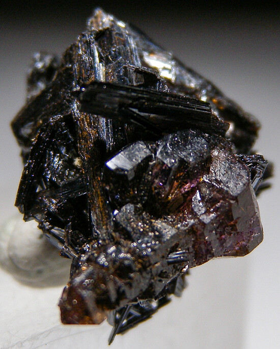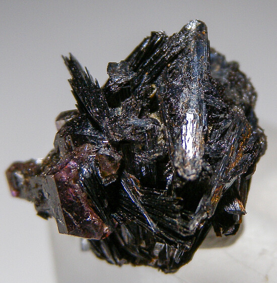 A 1cm double-terminated Amethyst crystal attached to a cluster of metallic Stibnite (?). This was in an old collection with a hand written label identifying it as Kermesite.