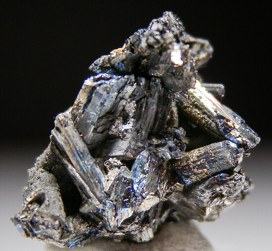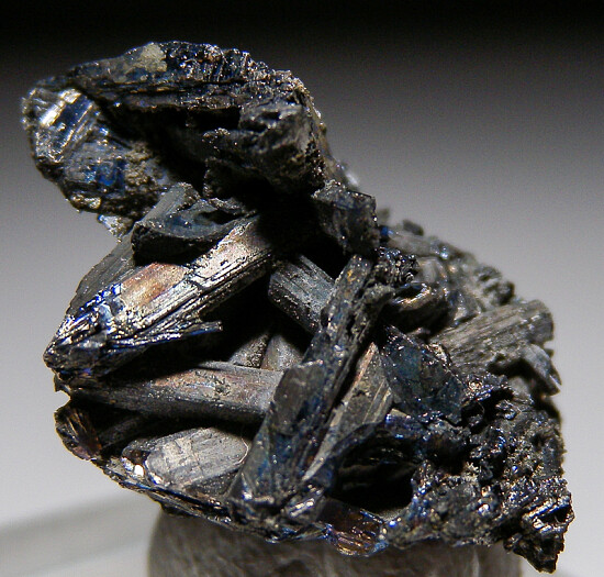 A small cluster of metallic Stibnite (?) crystals from an unknown locality. This was in an old collection with a hand written label identifying it as Kermesite.