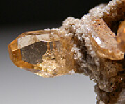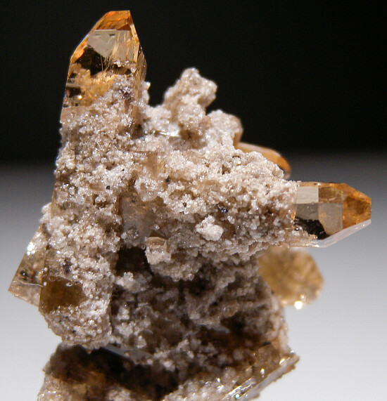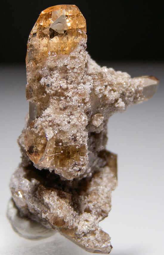 Cluster of gem Topaz crystals from Utah. Well terminated transparent crystals to 2.3cm long. Ex. John Sulzbach collection.